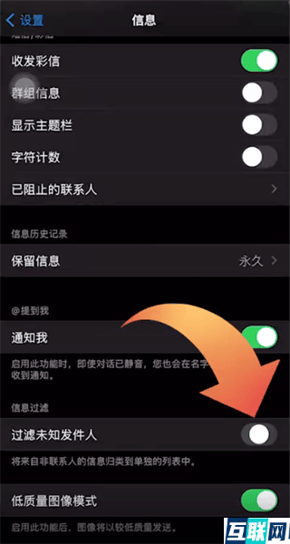 2. 点击信息过滤下的未知与过滤信息,接下来滑动按钮开启过滤未知发件人就可以拦截垃圾短信了。