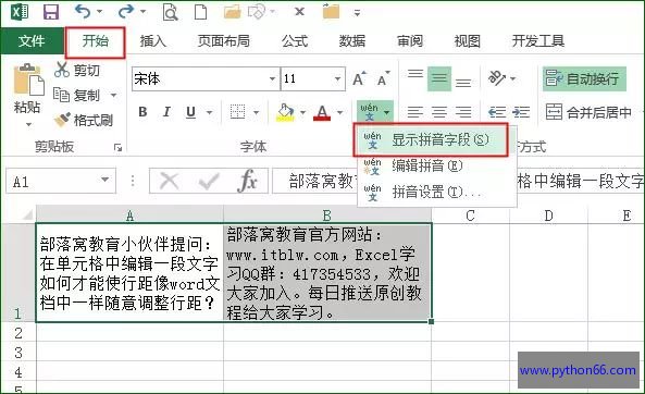 选中要处理的单元格,比如A1:B1单元格,单击“开始→显示拼音字段”,行间距马上就变大了。