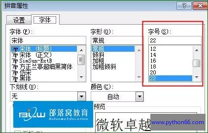 弹出的“拼音属性”对话框,设置字号。字号越大,单元格文字的行间距就会越大。