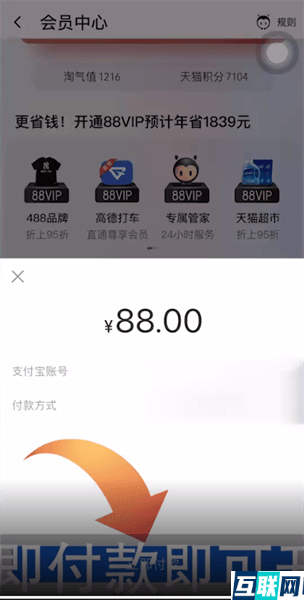 2. 然后即可看到“88元开通年度VIP”和“88元连续包年88VIP”两种选择,选择其中一种,再点击立即付款即可开通成功了。
