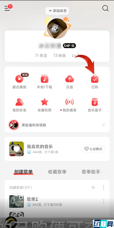 1. 1.在网易云音乐中点击我的选项,随后选择页面中的已购便可查看自己买歌曲专辑,不过网易云中只能赠送自己拥有的重复歌曲,并不能送自己没有的专辑歌曲。