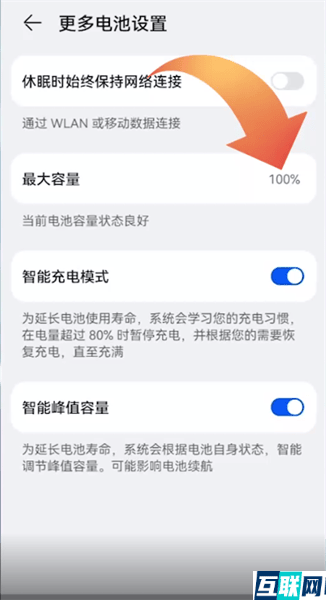 3. 3.接下来即可看到最大容量选项了,100%是电池健康的理论值,使用一段时间后会产生损耗。