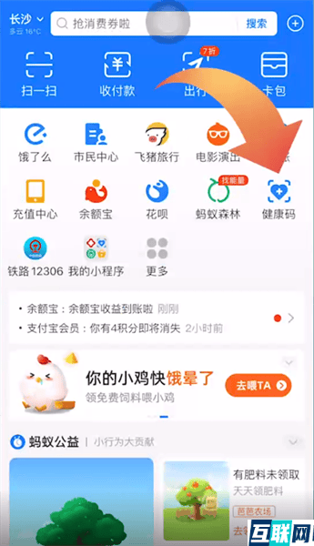 1. 1.首先打开支付宝app,在支付宝首页点击健康码选项,