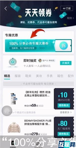 2. 接着在上方的【专属优惠】栏可以看到“100%分享必得专属优惠券”活动,点击进入后选择要分享的群或好友,