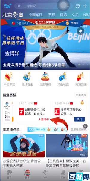 2. 2、这时即可看到冬奥会专区,点击赛程区的“直播中”即可观看直播中的赛程了。