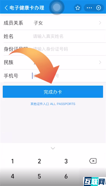 3. 3.在成员关系处选择成员关系,接下来输入姓名、身份证号码和手机号,再点击完成办卡即可。