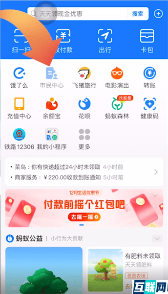 1. 1.如果想要查询社保卡账户的话,首先打开支付宝app,点击首页的市民中心选项,