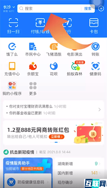 1. 1.想要在支付宝查询行程码的话,首先打开支付宝app,在支付宝首页点击顶端搜索栏,
