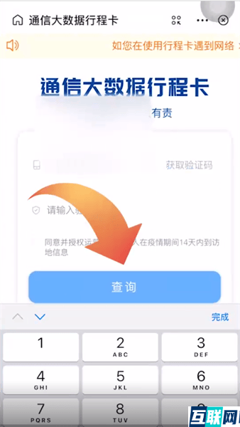 3. 3.进入行程卡页面后,输入手机号,然后再输入验证码,接下来再点击查询即可获取行程码了。