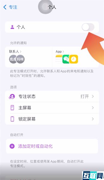 5. 5.设置完毕后,滑动个人旁的按钮开启个人专注模式就可以了。