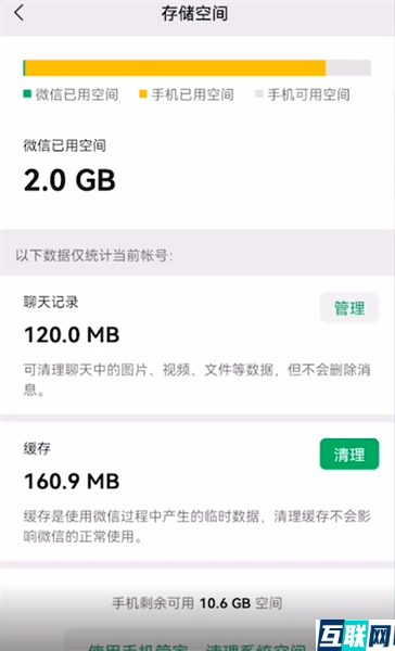 3. 3.这下即可看到微信已用的空间了,还可以点击清理选项进行缓存的清理。