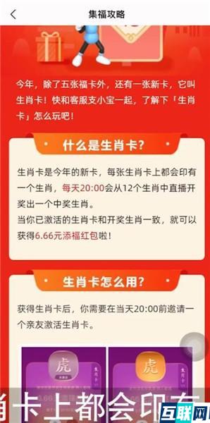 11. 生肖卡 生肖卡是今年的新卡,每张生肖卡上都会印有一个生肖,通过集福卡的方式均有机会获得生肖卡。获得生肖卡后,需要在当天20:00前邀请一个亲友激活生肖卡。每天20:00会从12个生肖中直播开奖出一个中奖生肖。当你已激活的生肖卡和开奖生肖一致,你和亲友都可以获得6.66元添福红包。