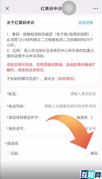 3. 进入后点击服务选项,这时再点击“红黄码申诉”,输入身份信息后选择“黄码”,
