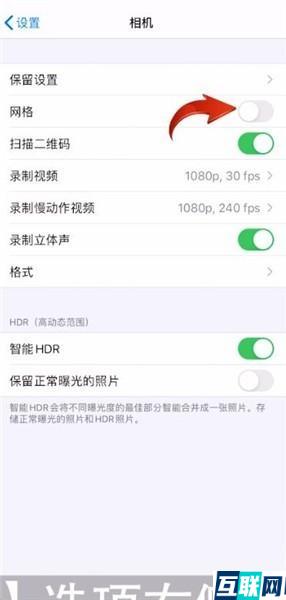 2. 接着将【网格】选项右侧的开关按钮打开,此时打开【相机】应用就可以使用九宫格了。