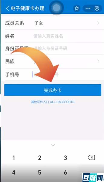 3. 3.在成员关系处选择子女,接下来输入姓名、身份证号码和手机号,再点击完成办卡即可。