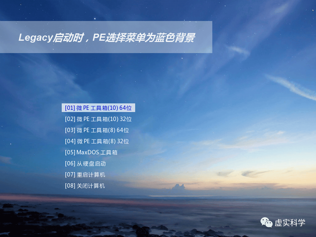 选中需要启动的U盘选项,继续敲回车之后,均会先进入PE版本选择界面。但以不同的方式进入,显示的PE选择界面是不同的。Legacy启动时,PE选择菜单为蓝色天空背景。UEFI启动时,PE选择菜单为黑色纯色背景。