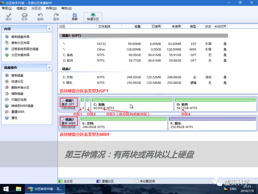 进行这个操作需要借助专业的分区工具,这里我们推荐分区助手,比较简单直观。打开PE桌面上的“分区助手(无损)”。查看电脑里的硬盘和分区信息,了解每个硬盘的分区表类型,并定位系统分区所在位置,您大概会看到下面三种情况: