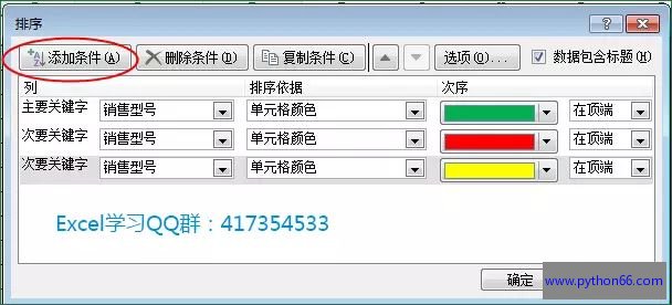 第二步:先添加“主要关键字”,然后再添加两个条件,按照下面截图所示进行设置。确定,即可实现按单元格颜色进行排序。