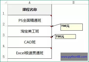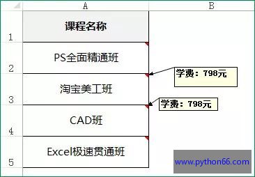 部落窝excel教程:excel批量修改批注技巧。下面的课程名称,每个Excel单元格都有批注,批注内容分别是:“学费:***元”。