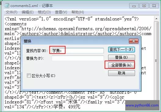 3. 右键单击comments1.xml文件,在右键菜单中依次单击【打开方式】——【记事本】。在记事本中打开后,按Ctrl+H,打开替换对话框,查找内容输入:学费:,点击“全部替换”。这样就可以将每个批注里面的学费:字给删掉。然后保存关闭comments1.xml文件。