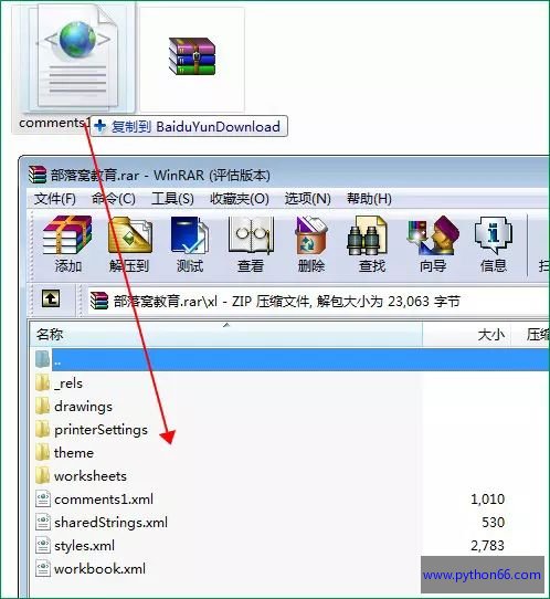 4. 按住comments1.xml不放,拖回到WinRAR界面中,替换压缩文件里面的comments1.xml,关闭WinRAR。