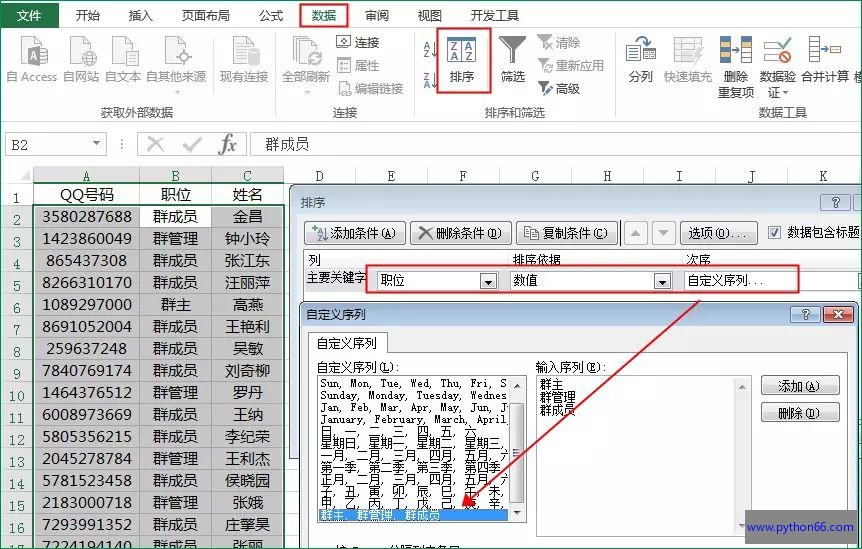 部落窝excel教程:Excel自定义排序实操运用案例分享。Excel自定义排序实际工作中用得蛮多的。比如下面截图左边的数据源,数据进行了虚拟处理哈。右边是根据职位不同排序,包含群主、群管理、群成员。