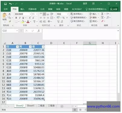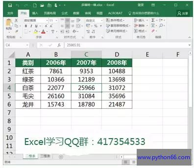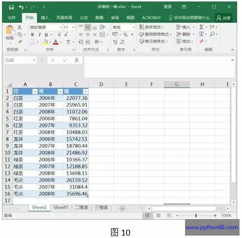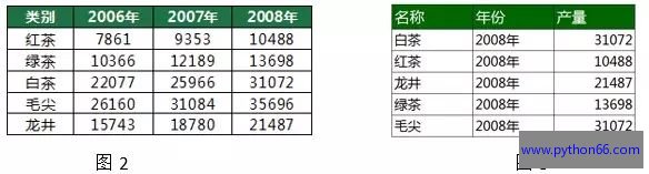 我们举一个简单例子: 从图2可以看出它是个二维统计表,因为表哥录入数据的时候把年份放在列上了,最近老板要求他重新对2008年的各类茶叶的产量进行综合统计,必须一行要一个分类一个年份一个产量,如图3所示,以便后续能够快速进行数据跟踪。