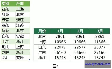 通过上面的判断依据,很显然:图1左侧的表是一维表,它的类别、产地是两个不同的列参数;而右侧的是二维表,它的1月、2月、3月属于一组性质相同的“月份”参数。