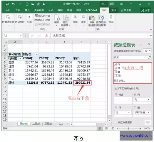 第五步:此时,表格已有很大改变,如图8。接下来,见证奇迹的时刻,在表格右侧,在“数据透视表字段”窗格中,一般会自动勾选,如果没勾选,选中“行”“列”“值”三项。