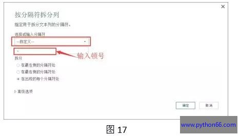 第五步:弹出“按分隔符拆分列”对话框,在下拉列表中选择“自定义”选项,在输入框中输入“顿号”,再单击确定。