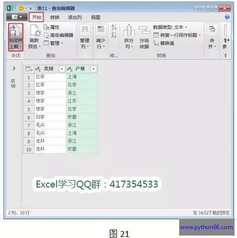 第九步:选择“开始”选项卡,单击“关闭并上载”按钮,关闭表格查询编辑器。