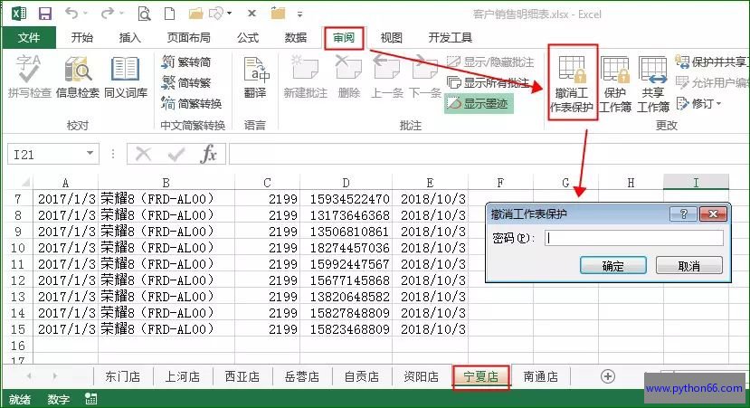 这个Excel“客户销售明细表”文件,包含8张Excel工作表,其中第七张(sheet7)是“宁夏店”的销售数据。从图中,可以看到这个工作表是有密码的,单击“撤销工作表保护”,要求我们输入密码,可是密码忘记了,怎么办呢?
