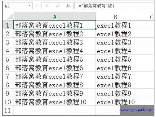 假设数据包含固定内容“部落窝教育”,需要输入到A1:A10单元格区域。我们可以在B1:B10区域先输入数据中除固定内容以外的那些内容,然后点击A2单元格,输入公式“="部落窝教育"&B1”,完成后拖动此单元格填充句柄向下复制公式至A10单元格就可以得到完整数据了。