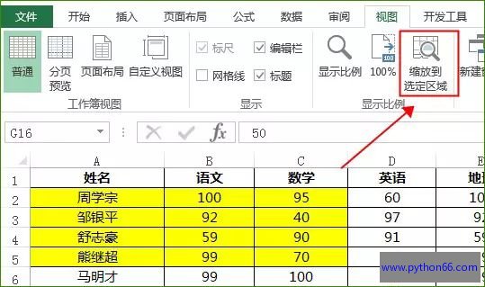 比如咱们需要将下面截图所示的标黄部分的单元格区域放大显示,可以这样操作:选择A2:C5单元格区域,单击“文件——缩放到选定区域”,可以看到选中的区域占满了咱们整个屏幕,放大显示了。再单击“缩放到选定区域” 左边的”100%”按钮返回实际大小页面。