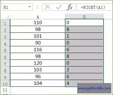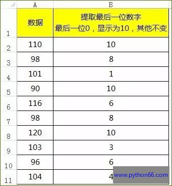 再加个条件,升华一下。我们将A列的数据最后一位提取出来放在B列,并且最后一位如果是0,就显示为10,其他保持最后一位不变。