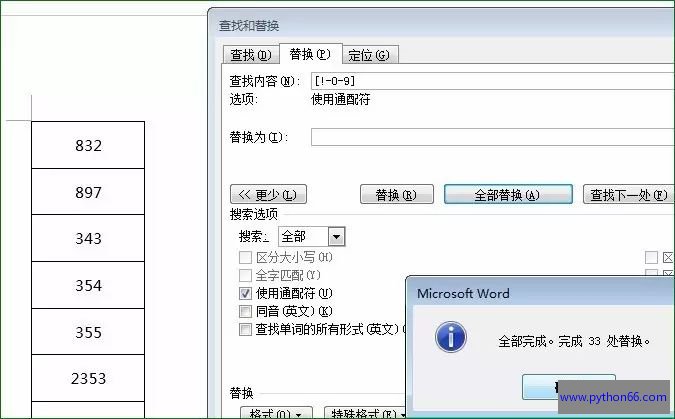 然后,按下CTRL+H,打开替换对话框,查找内容框中输入:[!-0-9],并勾选“使用通配符”,全部替换。效果如下: