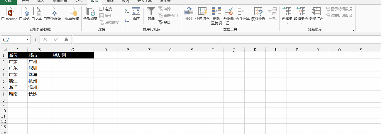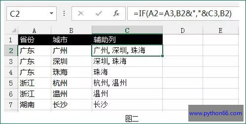 此时可以发现,每个省份第一次出现的那行,显示的是这个省份出现过的所有城市用逗号连接起来的文本。这些文本恰恰是我们想要的结果!