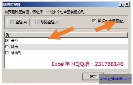 ③在“删除重复项”对话框,勾选“数据包含标题”,列那里只勾选“省份”。最后按确定。