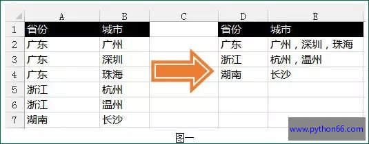 如上图,将左边的表转为右边的表。看起来要求很简单啊,如果完全手工敲键盘解决的话,可以这样做:先在左边的表筛选省份为广东的行,看到城市有广州、深圳和珠海,然后敲入“广东 广州,深圳,珠海”,然后筛选浙江,如此重复。如果行数很少,这方法还能接受。但如果几百上千行,那么表妹们使用洪荒之力才能解决!