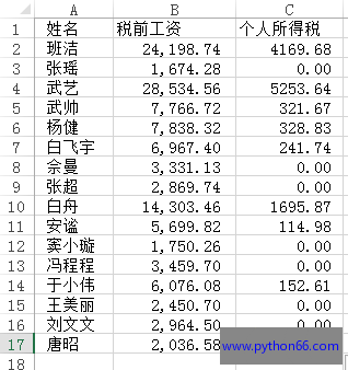 直接在C2单元格输入=tax(B2),即可计算得到个人所得税,并采用下拉,将其余单元格填满,计算得出每位员工的个人所得税,结果如下表所示。