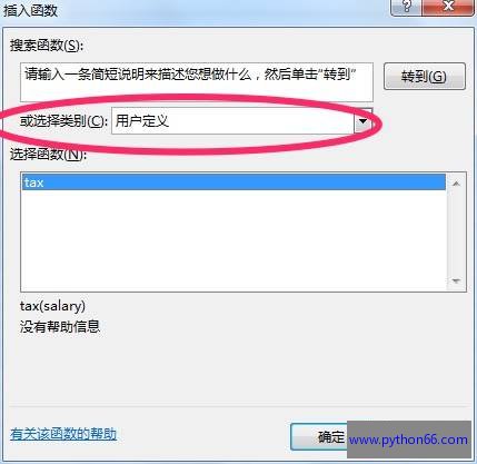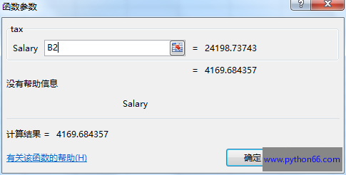 此外,还可以通过“插入函数”对话框调用自定义的函数,步骤主要是:点击“公式”选项卡,单击“函数库”选项组中“插入函数”命令,弹出“插入函数”对话框,在“选择类别”下拉菜单中选择“用户定义”,在“选择函数”中选择tax,点击“确定”,弹出“函数参数”对话框,输入“B2”,得到C2的结果,并采用下拉,将其余单元格填满,计算得出每位员工的个人所得税。
