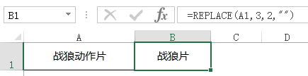 函数的意思是:A1单元格的字符,从第3个字符(也就是“动”)起,将连续的2个字符(也就是“动作”),替换成空(最后一个参数文本)。