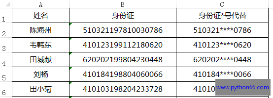 B列是身份证,C列是将B列的出生日期用四个星号代替。