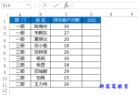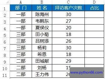 统计每个部门员工对拜访客户次数的占比。
