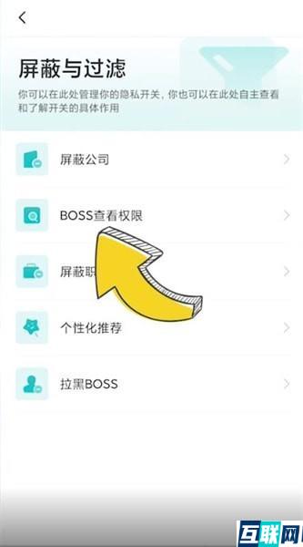2. 点击页面右上角设置按钮,点击【屏蔽与过滤】,选择【boss查看权限】进入,
