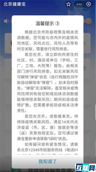 1. 1.如人员在京,需立即向所居住的社区、村、酒店或单位报告,由相关部门进行风险排查,如无关联风险可解除“弹窗”状态(自行核酸检测不能自动解除本“弹窗”)。如未及时报告,“弹窗”无法解除,直至相关疫情风险得到有效控制或后续流调数据能够排除关联风险。