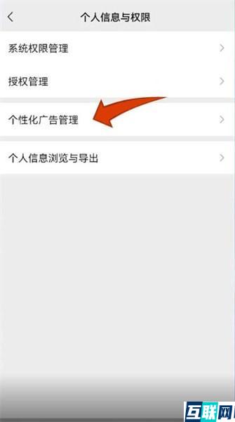 2. 点击【个人信息与权限】,在【个人信息与权限】页面点击【个性化广告管理】,