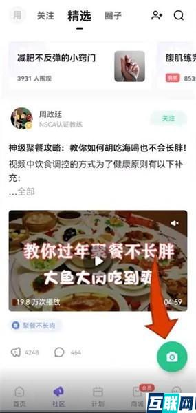 1. 首先打开Keep,点击【社区】。在【社区】页面,点击右下角的拍摄图标,进入相册。