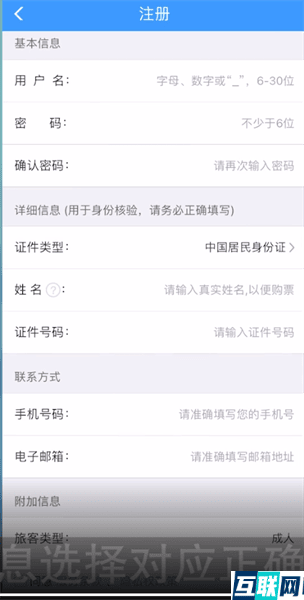 2. 按要求输入用户名,再输入包含字母、数字、下划线中的两种或两种以上的密码、证件信息、手机号码和邮箱,选择对应正确的旅客类型即可。