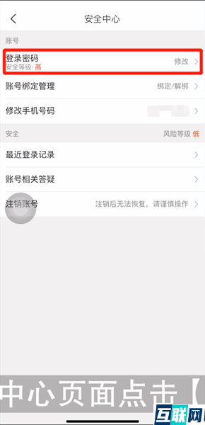 2. 点击【账号与安全】选项,接着在安全中心页面点击【登录密码】,